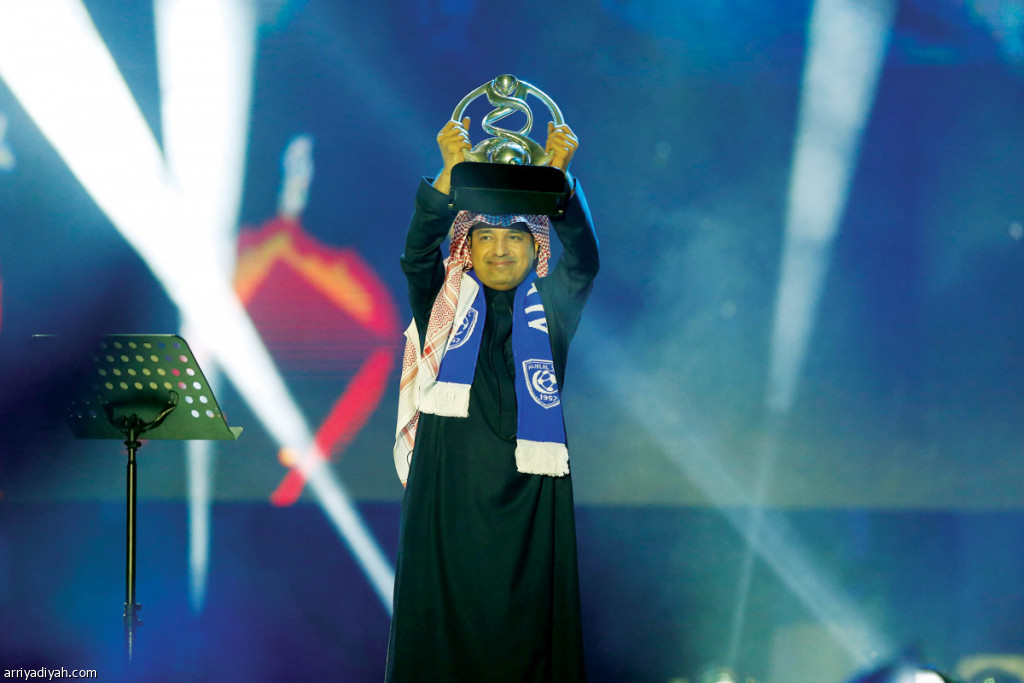 ما إن اعتلى راشد الماجد خشبة المسرح حتى دوَّت عاصفة من التصفيق من قِبل الجماهير الحاضرة في الحفل ترحيبًا به.. وفي الصورة التي التقطت أمس يخطف راشد الماجد الكأس من المنصة التي وُضِعت عليها ويُقبِّلها ويرفعها إلى الأعلى ما أثار حماس الجمهور تصوير: بدر الحمد