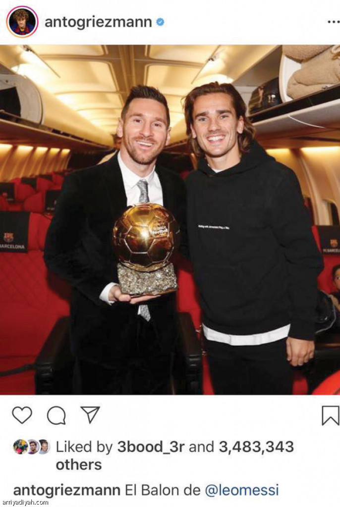 شارك الفرنسي أنطوان جريزمان مهاجم فريق برشلونة الأول لكرة القدم الأرجنتيني ليونيل ميسي قائد الفريق، فرحته بالحصول على جائزة الكرة الذهبية لأفضل لاعب في العالم. ونشر الفرنسي صورته مع ميسي داخل الطائرة أثناء عودتهما من باريس إلى برشلونة. الصورة نالت إعجاب 3.483 مليون متابع وأكثر من 16 ألف تعليق.
