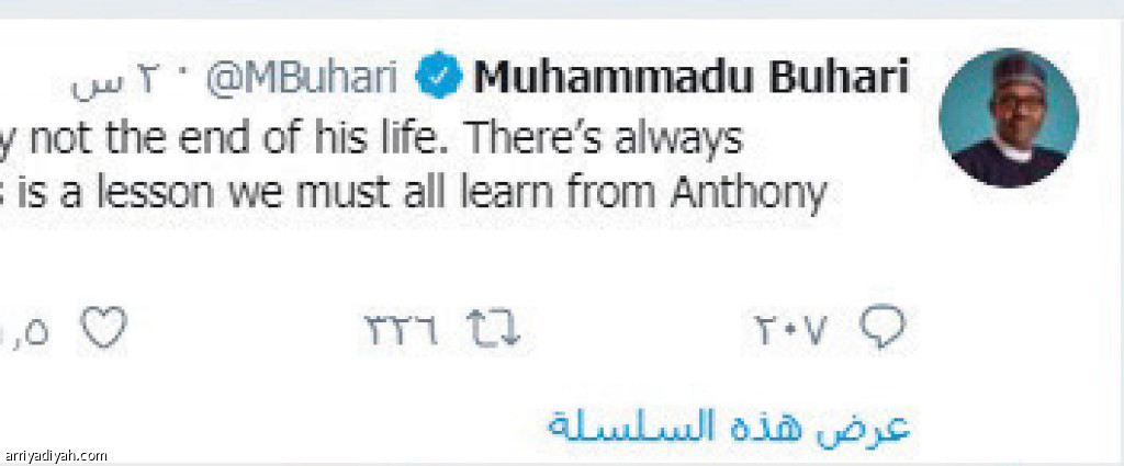 طالب محمدو بخاري، رئيس نيجيريا، الدول بالاقتداء بعزيمة أنتوني جوشوا، الملاكم البريطاني، وعدم الاستسلام، وذلك من خلال تغريدة عبر حسابه على “تويتر”.