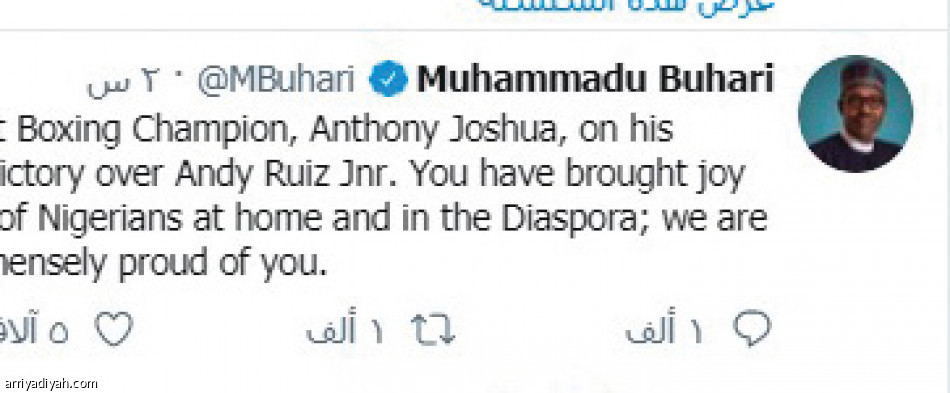 طالب محمدو بخاري، رئيس نيجيريا، الدول بالاقتداء بعزيمة أنتوني جوشوا، الملاكم البريطاني، وعدم الاستسلام، وذلك من خلال تغريدة عبر حسابه على “تويتر”.