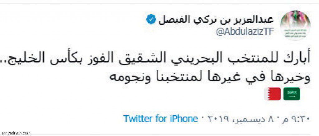 قدم الأمير عبد العزيز الفيصل، رئيس الهيئة العامة للرياضة، التهنئة لمنتخب البحرين بمناسبة فوزه ببطولة “خليجي 24”. وكتب الفيصل عبر حسابه على موقع التواصل الاجتماعي “تويتر” “أبارك للمنتخب البحريني الشقيق الفوز بكأس الخليج.. وخيرها في غيرها لمنتخبنا ونجومه”. يذكر أن جميع ردود الفعل من قبل السعوديين اتسمت بالروح الرياضية رغم خسارة الأخضر.