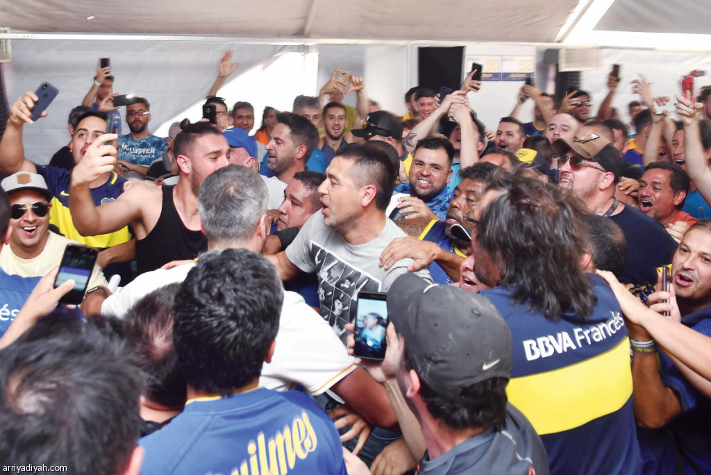 صورة التقطت أمس للأرجنتيني خوان رومان ريكليمي لاعب كرة القدم المعتزل محاطاً بأنصاره لدى وصوله إلى مقر بوكا جونيوز ناديه السابق للتصويت في انتخاباته التي يخوضها على مقعد نائب الرئيس