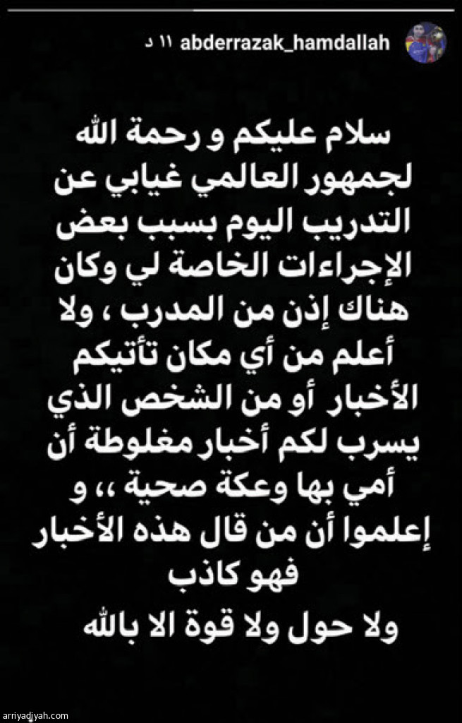 نفى المغربي عبدالرزاق حمد الله لاعب فريق النصر، ما أورده حساب النادي على “تويتر” بأن غيابه عن التدريبات بسبب مرض والدته. وعلق حمد الله عبر حسابه على إنستجرام قائلًا “سلام عليكم ورحمة الله جمهور العالمي.. غيابي عن التدريب اليوم بسبب بعض الإجراءات الخاصة لي وكان هناك إذن من المدرب، ولا أعلم من أين تأتيكم الأخبار، أو من الشخص الذي يسرب لكم أخبارًا مغلوطة، أن أمي بها وعكة صحية واعلموا أن من قال ذلك فهو كاذب”. وبعد نحو ثلاث ساعات حذف اللاعب المنشور من صفحته.