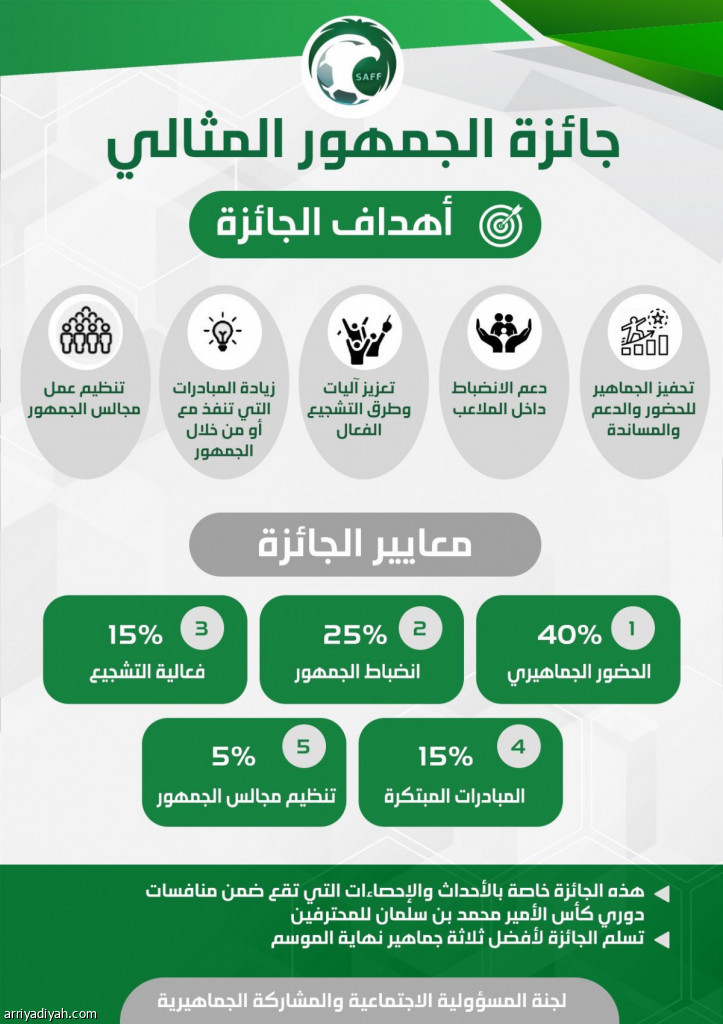 أعلنت لجنة المسؤولية الاجتماعية والمشاركة الجماهيرية في اتحاد القدم السعودي، أمس، جائزة للجمهور المثالي للموسم الرياضي الجاري. وأوضح اتحاد القدم أن أهداف الجائزة تتمحور حول تحفيز الجماهير للحضور والدعم والمساندة والانضباط داخل الملاعب، وتعزيز آليات وطرق التشجيع الفعال وزيادة المبادرات التي تنفذ من خلال الجمهور وتنظيم عمل مجالس الجمهور. كما بيَّن معايير الجائزة التي جاء 40 في المئة منها على الحضور الجماهيري، 25 في المئة لانضباط الجمهور، 15 في المئة على فعالية التشجيع، 15 في المئة على المبادرات المبتكرة، و5 في المئة على تنظيم مجالس الجمهور.