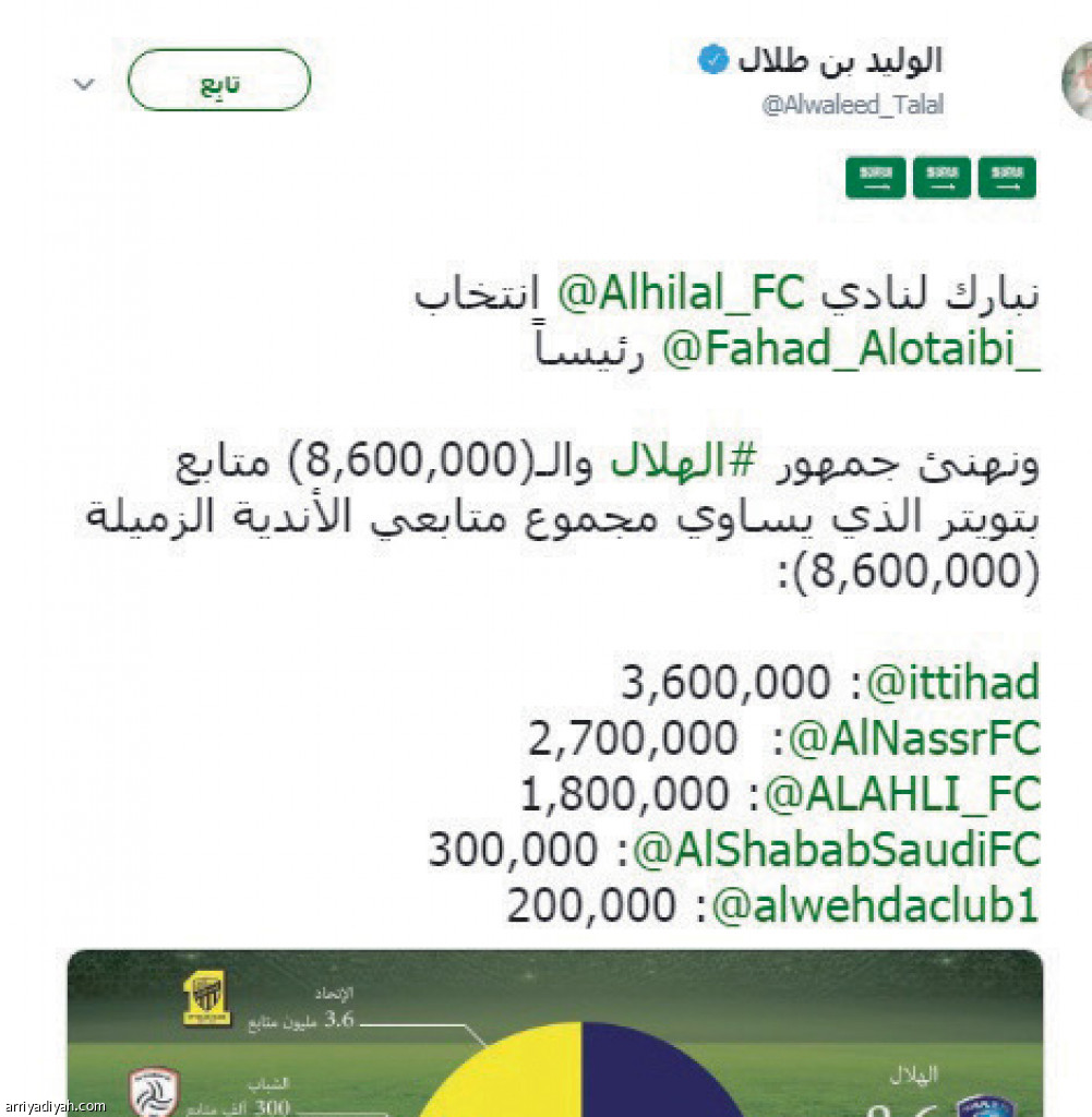 كما سيطر وسم الهلال “#الهلال على قائمة الوسوم” الهاشتاقات الأكثر استخدامًا في التغريدات السعودية خلال العام ذاته، فيما حلت خلفه وسوم كل من #النصر،#الاتحاد، #الأهلي،#الشباب،#التعاون.