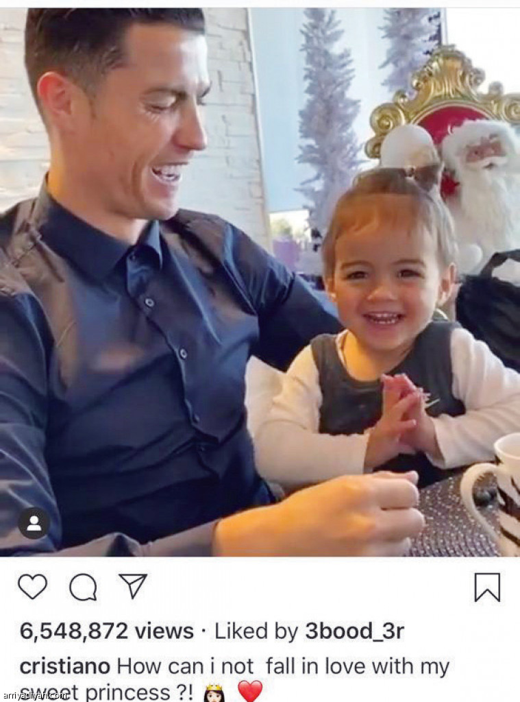 تفاعل أكثر من 6.5 مليون متابع لحساب البرتغالي كريستيانو رونالدو مع مقطع الفيديو الذي نشره على حسابه في إنستجرام أمس وهو يداعب طفلة صغيرة في إحدى المناسبات الاجتماعية. وتساءل لاعب فريق يوفنتوس الأول لكرة القدم: كيف لا أقع في حب هذه الأميرة الصغيرة؟!.