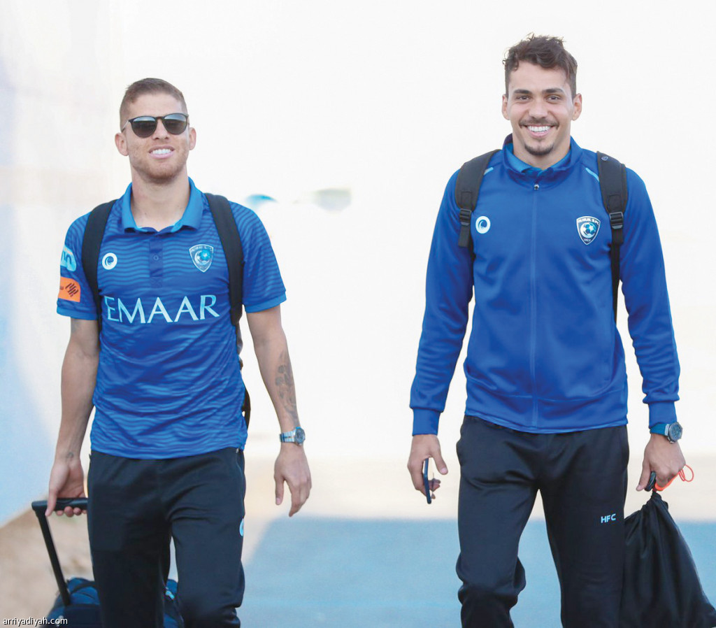 صورة التقطت أمس للبرازيلي إدواردو والكولومبي كويلار ثنائي فريق الهلال الأول لكرة القدم لحظة صعودهما الطائرة التي أقلتهما إلى الدوحة للمشاركة في بطولة كأس العالم للأندية (المركز الإعلامي ـ الهلال)
