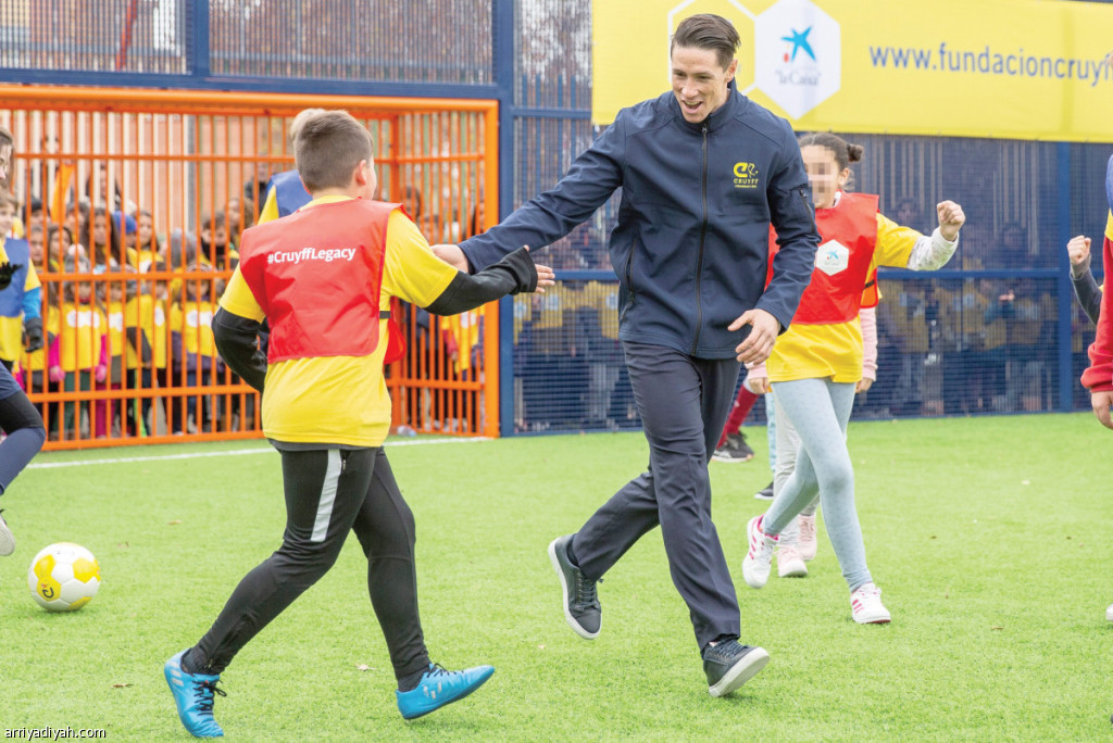 صورة التقطت أمس لفرناندو توريس، لاعب كرة القدم الإسباني الأسبق، مع طفل أثناء لعب كرة القدم خلال افتتاح ملعب “فرناندو توريس” في مدرسة فرانسيسكو كويفيدو في العاصمة الإسبانية مدريد (الأوروبية)