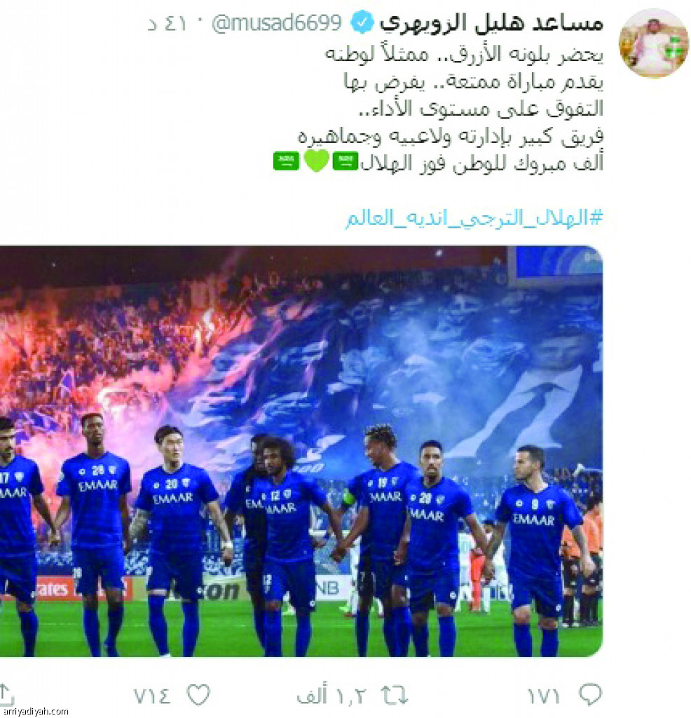 ونشر الزويهري صورة احتفالية للهلال، وعلق عليها قائلاً: “يحضر بلونه الأزرق.. ممثلاً لوطنه. يقدم مباراة ممتعة.. يفرض بها التفوق على مستوى الأداء.. فريق كبير بإدارته ولاعبيه وجماهيره.. ألف مبروك للوطن فوز الهلال”.