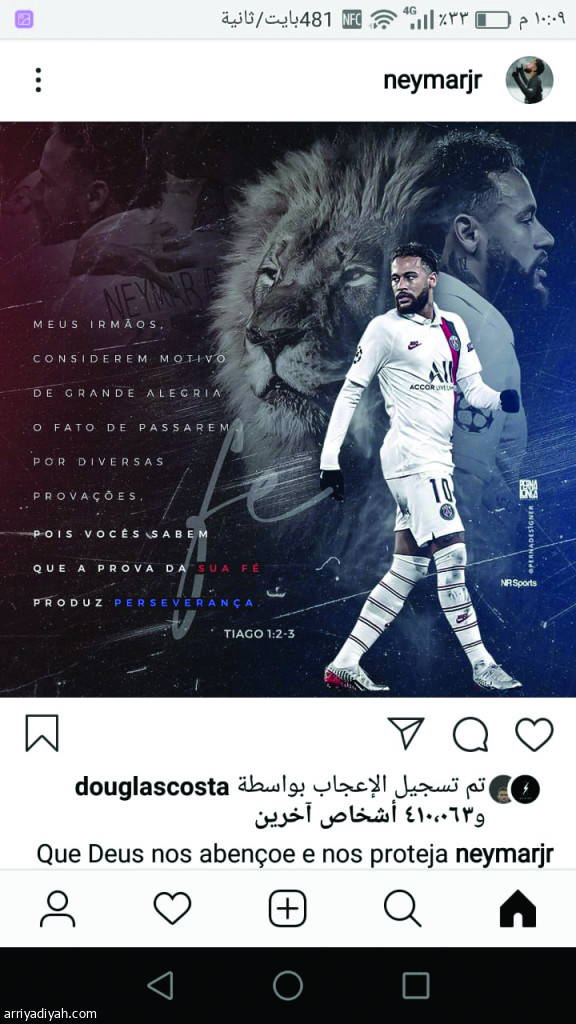 نشر البرازيلي نيمار دا سيلفا “بوست” عبر حسابيه على “تويتر” و”إنستجرام”، يتضمنان صورة له، وفي الخلفية أسد.