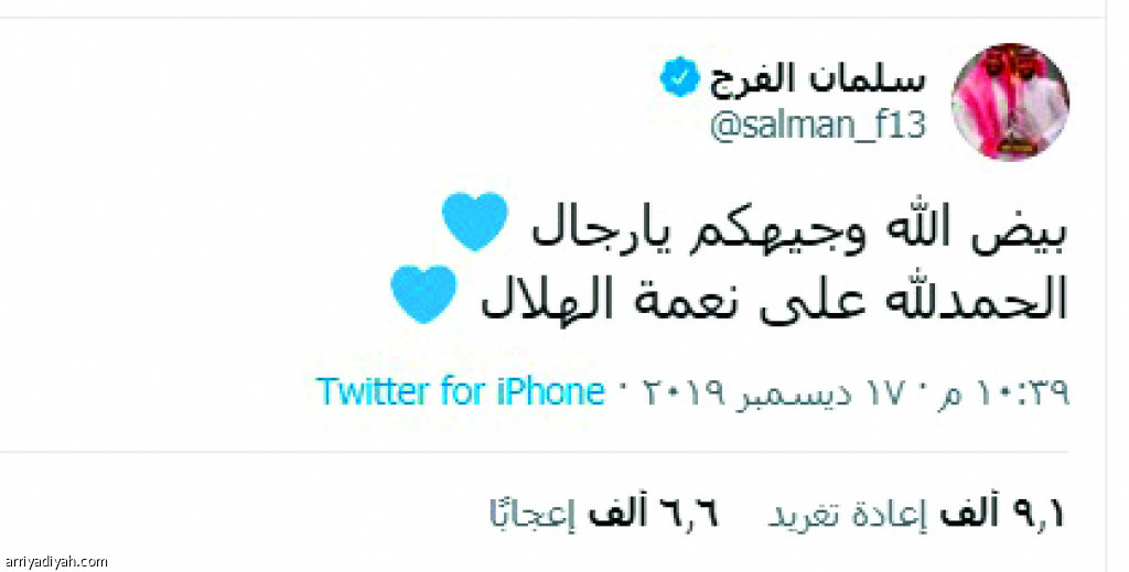 تفاعل الهلاليون مع تغريدة سالم الدوسري لاعب الفريق الأول لكرة القدم عبر حسابه على “تويتر” بشكل كبير. وكتب الدوسري في التغريدة “بيض الله وجيهكم يا رجال.. الحمد لله على نعمة الهلال”.