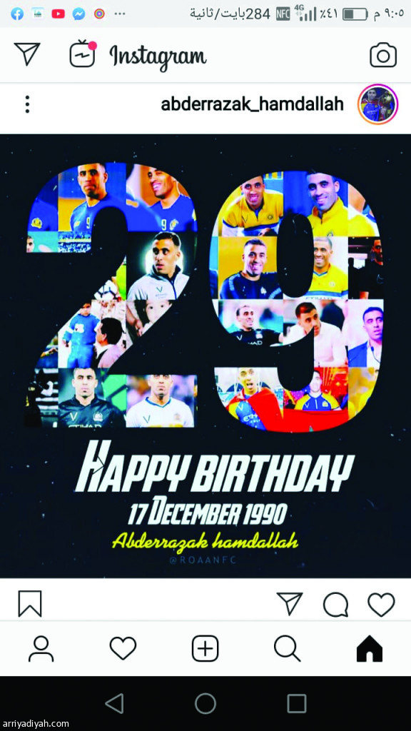 احتفل المغربي عبد الرزاق حمد الله، لاعب النصر، بيوم ميلاده الـ 29، من خلال بوست عبر حسابه على “إنستجرام” برقم 29 ويتضمن صورًا له.