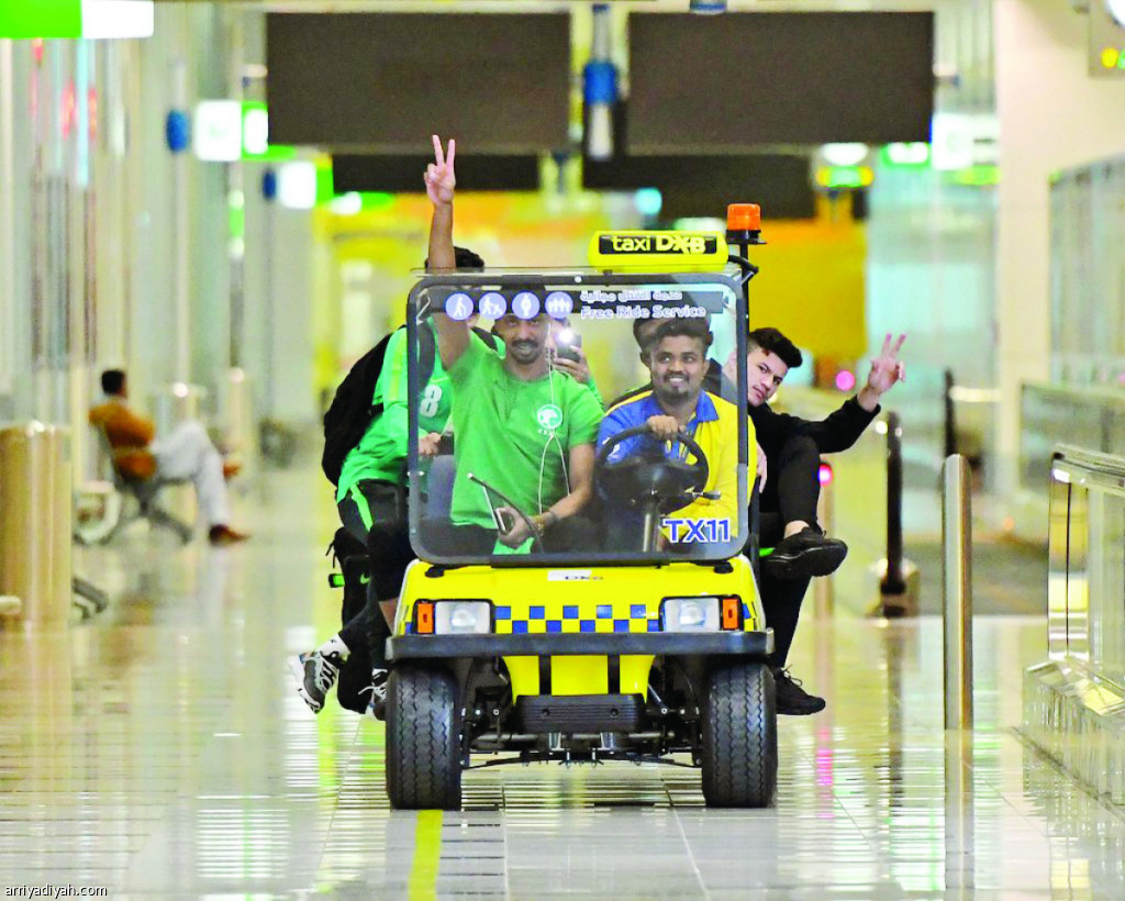 صورة التقطت أمس للاعبي المنتخب السعودي أثناء ركوبهم في السيارة الكهربائية في مطار دبي قبل المغادرة إلى العاصمة الماليزية كوالالمبور لخوض المعسكر استعدادًا لنهائيات كأس آسيا تحت 23 عامًا