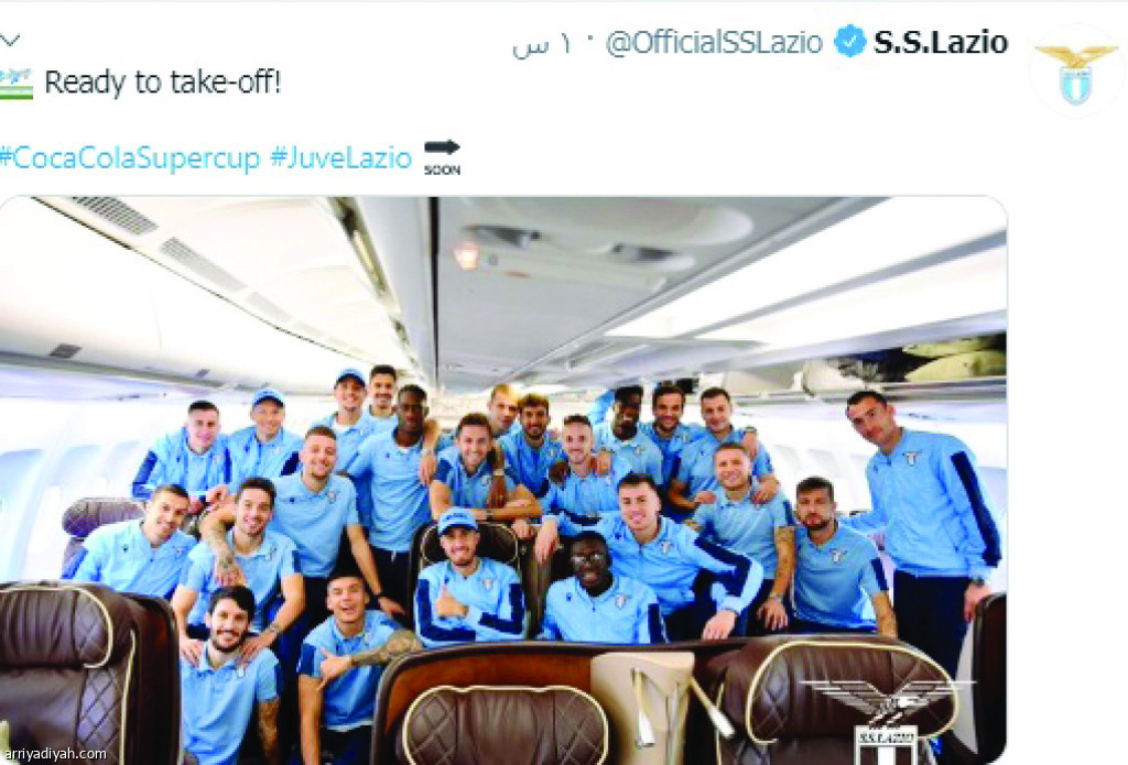بثَّ حساب نادي لاتسيو الإيطالي عبر تويتر صورة للاعبي الفريق الأول لكرة القدم داخل الطائرة الخاصة التي ستقلهم إلى الرياض لمواجهة يوفنتوس في كأس السوبر. وعلق الحساب على الصورة قائلًا: “جاهزون للإقلاع”، فيما نشر قبلها فيديو للاعبين لحظة نزولهم من الباص، وكتب: “الوجهة الرياض”. وحظيت التغريدة بنحو 20 ألف تفاعل بعد دقائق فقط من نشرها، إضافة إلى 30 ألف مشاهدة لفيديو اللاعبين.