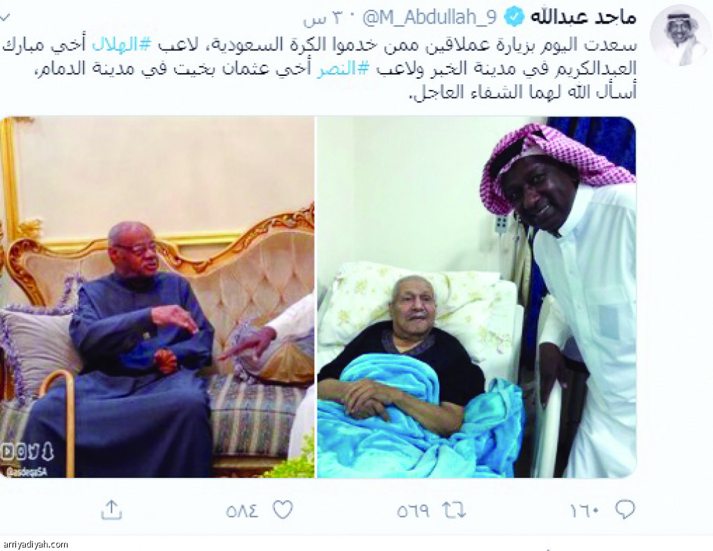 حظيت تغريدة ماجد عبد الله، السابق، مع مبارك العبد الكريم، لاعب الهلال السابق، وعثمان بخيت لاعب النصر السابق، بردود فعل واسعة من قبل المعلقين. ونشر ماجد صورتين مع اللاعبين وعلق عليها قائلًا: “سعدت اليوم بزيارة عملاقين ممن خدموا الكرة السعودية، أخي مبارك العبد الكريم وأخي عثمان بخيت.. أسأل الله لهما الشفاء العاجل”.