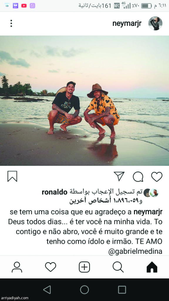 شارك البرازيلي نيمار جونيور لاعب باريس سان جيرمان متابعيه عبر إنستجرام بصورة له مع جبريل ميدينا مواطنه لاعب التزحلق وخلفهما البحر. وعلق نيمار على الصورة قائلًا “إذا كان هناك شيء واحد أشكر الله عليه كل يوم.. أن يكون ميدينا في حياتي”.