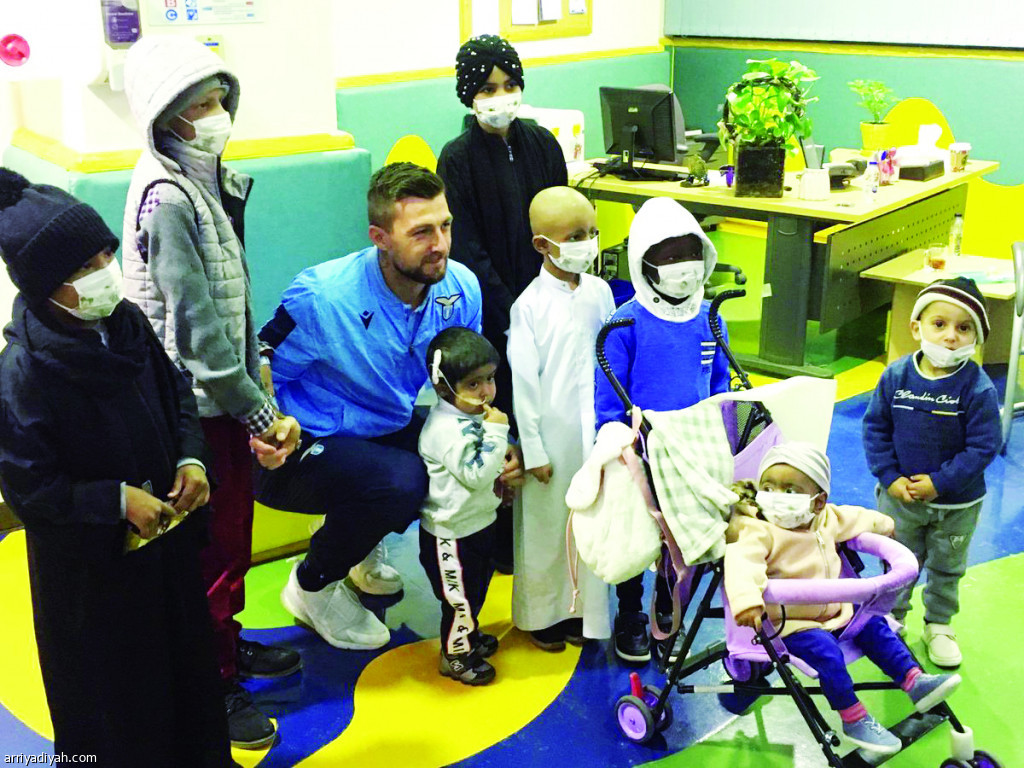 في الصورة التي التقطت أمس.. فرانشيسكو أتشيربي لاعب الفريق مع عدد من أطفال المركز (المركز الإعلامي ـ لاتسيو)