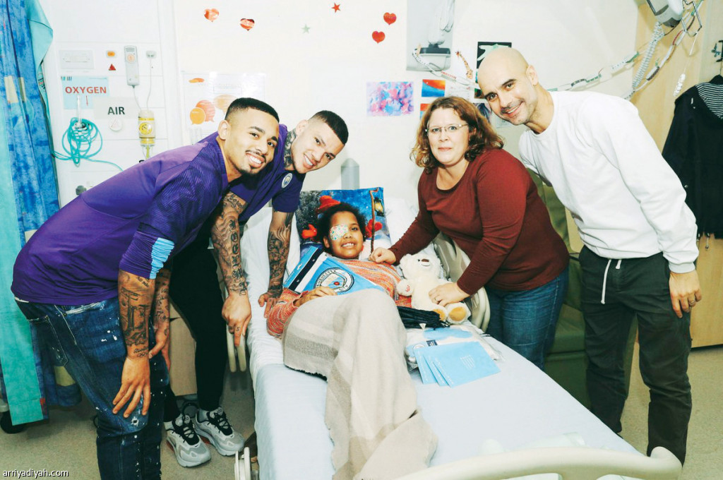 صورة التقطت أمس الأول للإسباني بيب جوارديولا مدرب فريق مانشستر سيتي الإنجليزي والبرازيليين إديرسون مورايس حارس المرمى وجابرييل خيسوس المهاجم أثناء زيارتهم مستشفى مانشستر الملكي للأطفال وتقديمهم الهدايا للأطفال المنومين ..