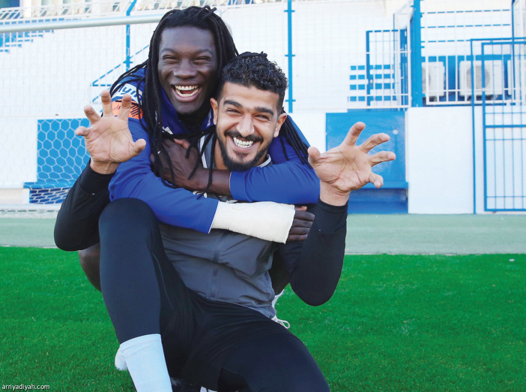صورة التقطت أمس للفرنسي جوميز لاعب فريق الهلال يمازح عبد الله المعيوف زميله قبل بداية الحصة المسائية استعدادًا لمباراة الحزم غدًا في الرس (المركز الإعلامي ـ الهلال)