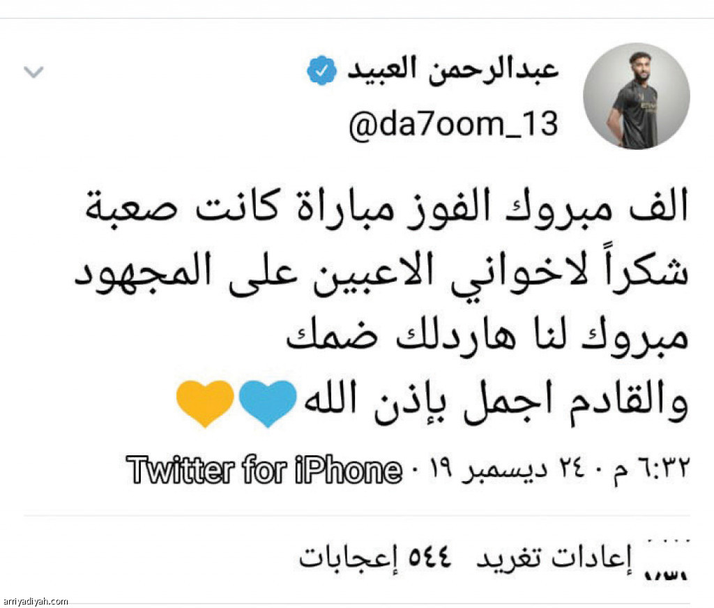 وعلق العبيد قائلًا “ألف مبروك الفوز.. مباراة كانت صعبة.. شكرًا لإخواني اللاعبين على المجهود.. مبروك لنا هاردلك ضمك والقادم أجمل بإذن الله”.