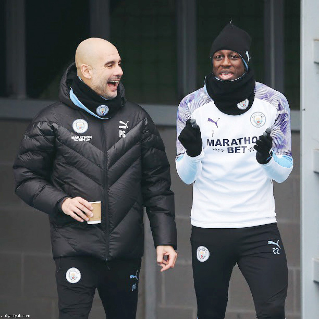 صورة التقطت أمس بيب جوارديولا مدرب السيتي برفقة بينجامين ميندي لاعب الفريق أثناء دخولهما التدريب قبل الأخير للمباراة (المركز الإعلامي ـ مانشستر سيتي)