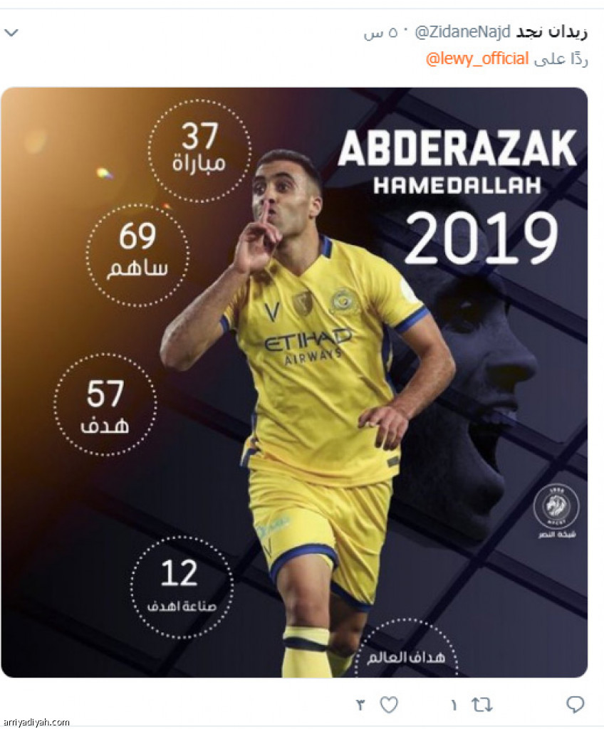 رد نصراويون، على تغريدة البولندي روبرت ليفاندوفيسكي مهاجم بايرن ميونخ الألماني، التي احتفل فيها مبكرًا، بصدارة هدافي العالم لعام 2019 برصيد 54 هدفًا، بعد أن فاجأه المغربي عبد الرزاق حمد الله مهاجم النصر بثلاثية أمس في شباك الفيحاء أزاحه من خلالها عن المقدمة برصيد 57 هدفًا.
