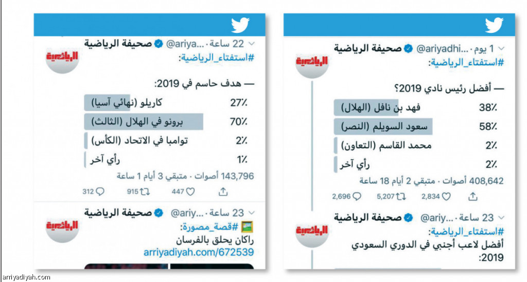 أما التغريدة الثانية لاختيار أفضل لاعب أجنبي فحصلت على مليون مشاهدة وصوت فيها 152 ألف مغرد وانحصر التنافس فيها بين حمد الله لاعب النصر “63%” وجوميز لاعب الهلال “31%” ودجانيني ورمارينهو لاعبي الأهلي والاتحاد “3%”. وحصلت التغريدة الثالثة لاختيار أفضل هدف حاسم وصوت فيها 143 ألف مغرد، اختار منهم 70% هدف برونو لاعب النصر في الهلال “الثالث”، و 27% انحازوا لهدف كاريلو في نهائي آسيا، فيما نال هدف توامبا في الاتحاد في نهائي الكأس على إعجاب 2%.