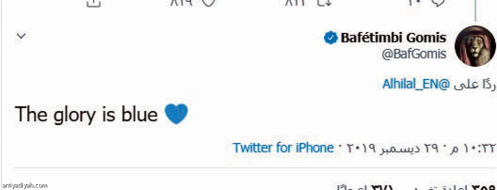 احتفل الفرنسي بافيتيمبي جوميز، لاعب فريق الهلال، بفوز النادي بجائزة “سوبر جلوب” كأفضل نادٍ عربي، من خلال رده على تغريدة حساب النادي باللغة الإنجليزية في “تويتر” قال فيها “المجد أزرق”.