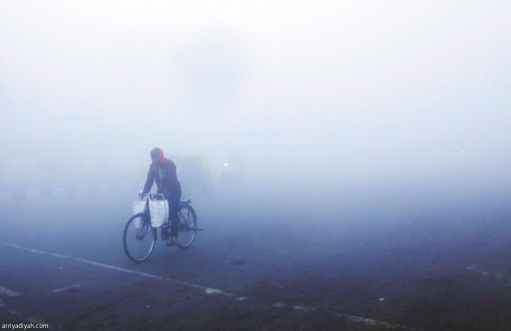 صورة التقطت أمس لرجل يقود دراجة في نيودلهي وسط ضباب كثيف أحجب الرؤية (رويترز)