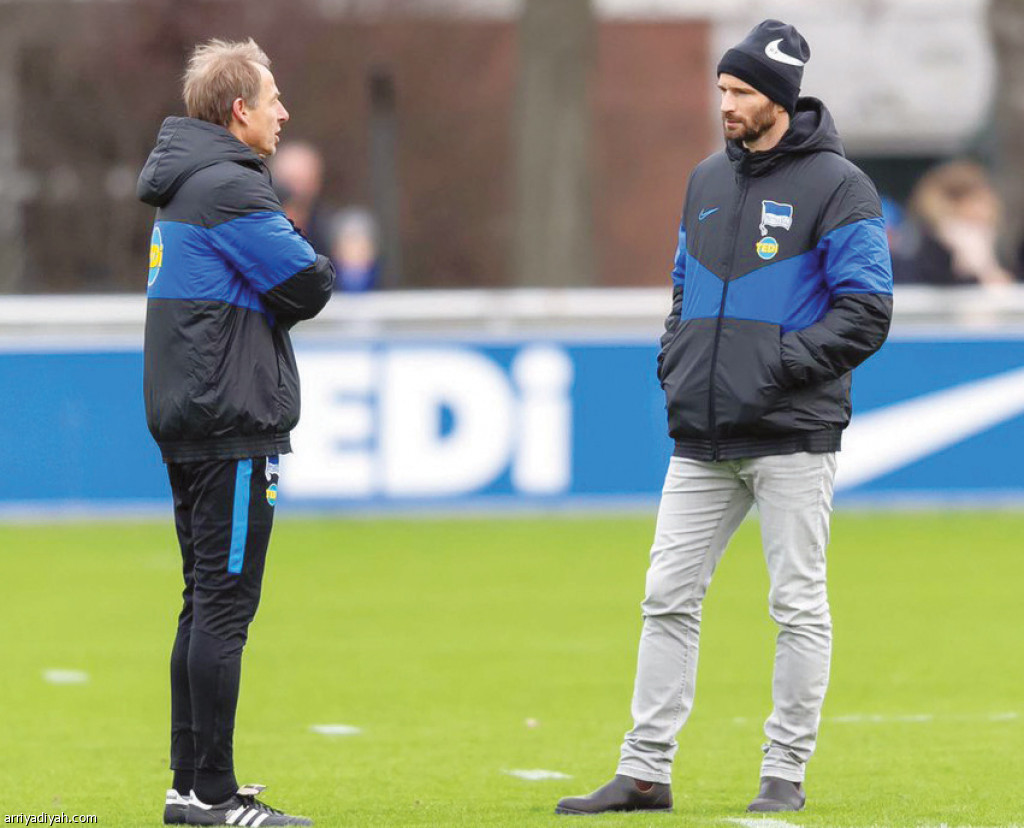 صورة التقطت أمس لكلينسمان يتحدث مع أحد مساعديه أثناء الحصة التدريبية لفريق هيرتا برلين (المركز الإعلامي ـ هرتا برلين)