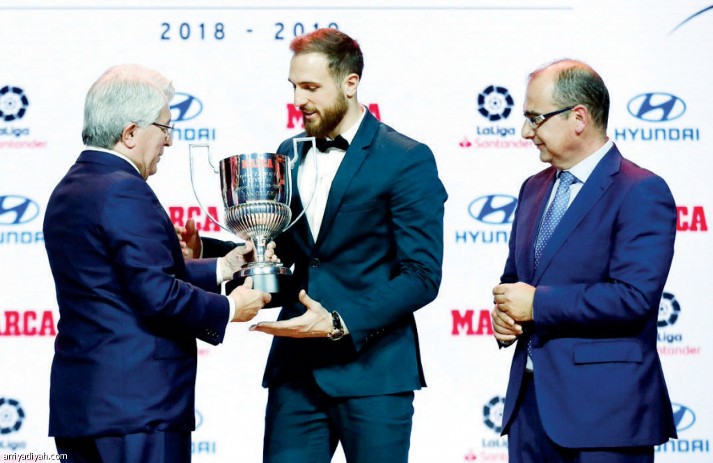 صورة التقطت في 17 ديسمبر الماضي لأوبلاك يتسلم جائزة زامورا لأفضل حارس في الدوري الإسباني لموسم 2018ـ2019 للمرة الرابعة على التوالي (المركز الإعلامي ـ أتلتيكو مدريد)