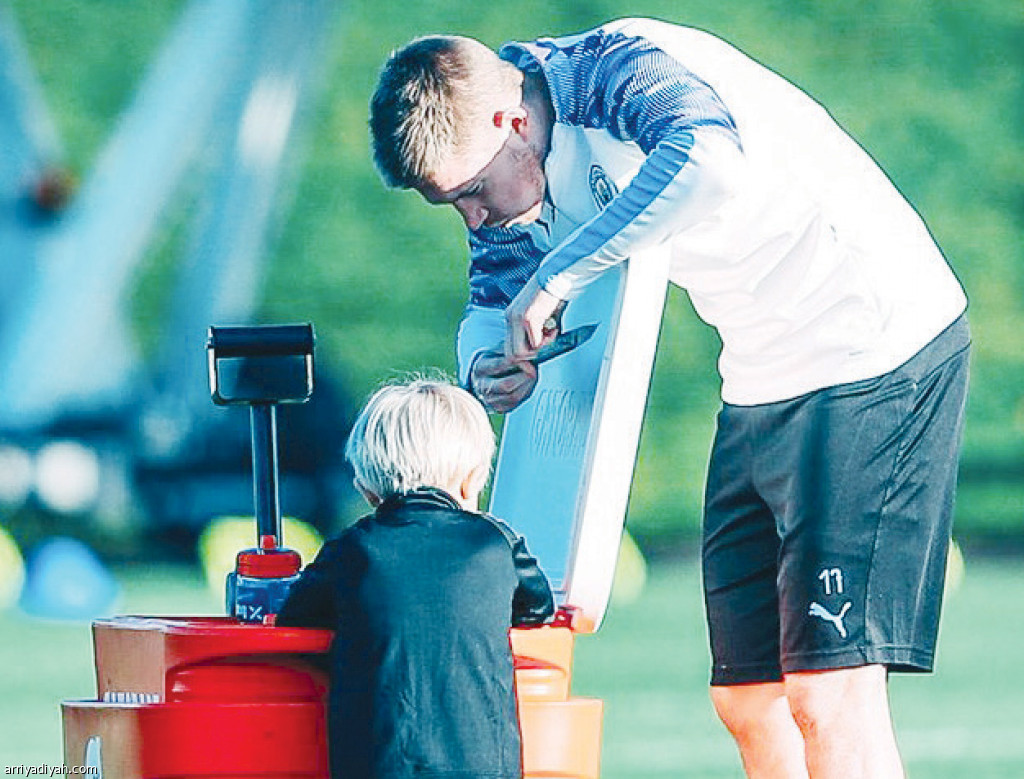 صورة التقطت أمس يظهر اللاعب البلجيكي كيفن دي بروين مع طفله قبل بدء التدريبات (المركز الإعلامي ـ مانشستر سيتي)