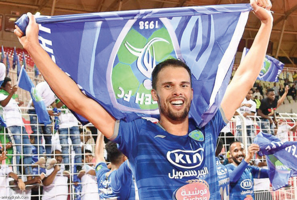 صورة التقطت أمس للهولندي فريدي لاعب فريق الفتح الأول لكرة القدم يحتفل أمام جماهير فريقه بعد إعلان التأهل إلى دور الـ 8 من مسابقة كأس الملك بعد الفوز على الاتحاد 2ـ1 (المركز الإعلامي ـ الفتح)