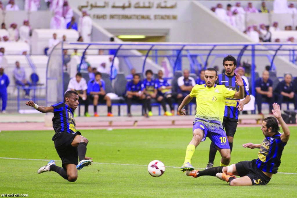 صورة التقطت لمحمد السهلاوي مهاجم النصر يسدد الكرة رغم اعتراض سند شراحيلي وشادي أبو هشهش لاعبي التعاون في المباراة التي جرت موسم 2013/‏2014، وانتهت بالتعادل وتوج بعدها النصر باللقب (أرشيفية)