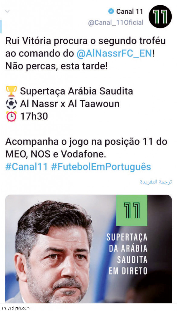 نقلت قناة الـ 11 البرتغالية مواجهة النصر والتعاون على كأس السوبر السعودي أمس للمرة الأولى.