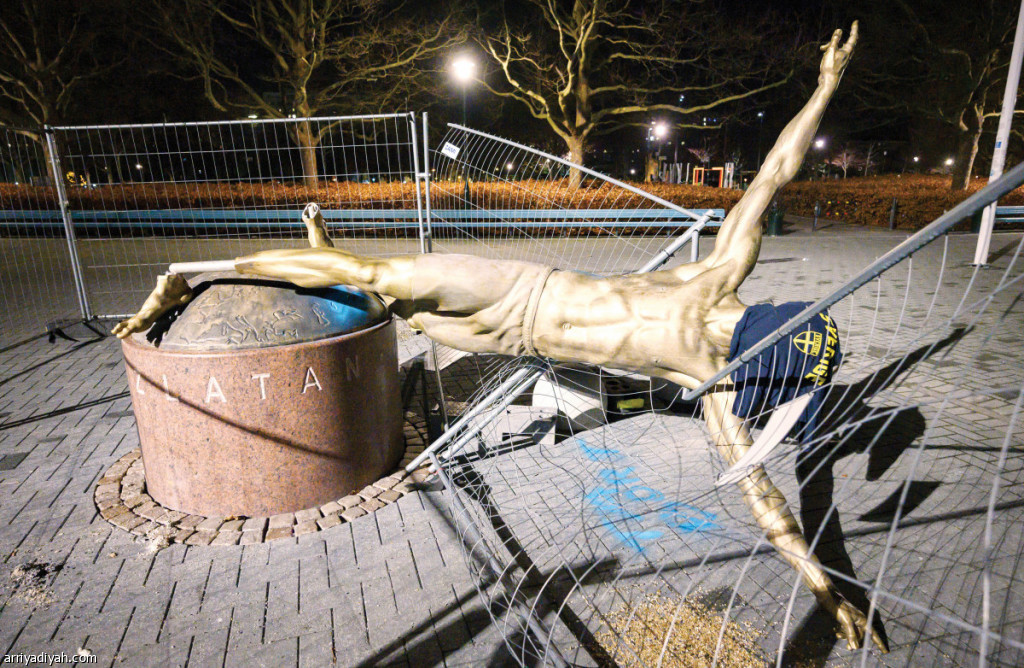 تعرض تمثال أسطورة كرة القدم السويدي زلاتان إبراهيموفيتش، الذي تم وضعه في مدينة مالمو السويدية، لعملية تدمير كاملة.