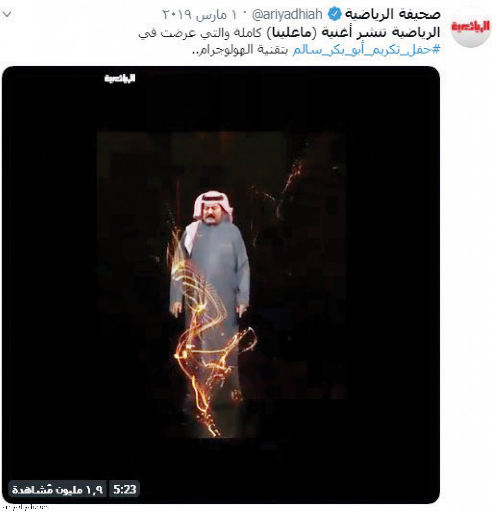 تصدرت تغريدة فيديو أغنية “ما علينا” لأبو بكر سالم، الفنان الراحل، بتقنية التصوير التجسيمي “الهولوجرام” أكثر التغريدات تفاعلاً في حساب “الرياضية” على “تويتر” في 2019 بنحو 3 ملايين تفاعل.