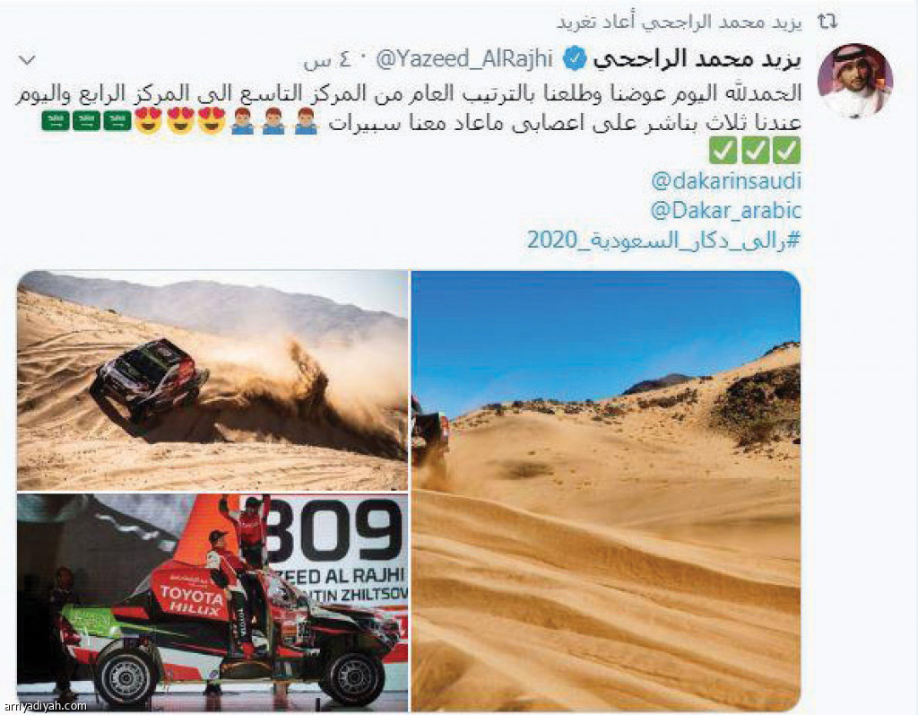 يتصدر يزيد الراجحي سائق الراليات السعودي المشاركين في رالي داكار السعودية من حيث عدد المتابعين في مواقع التواصل الاجتماعي والذين تجاوزوا المرحلة الثالثة. ويملك الراجحي نحو مليوني متابع 1.2 مليون في إنستجرام، و743.356 في تويتر. فيما يأتي الإسباني كارلوس ساينز بطل الجولة الثالثة في المركز الثاني بـ 237.631 ألف متابع. كما حل البولندي جاكوب بريزيونسكي في المركز الثالث بنحو 38 ألف متابع. ويعد الراجحي الأكثر تغريدًا عن الرالي من خلال صور مشاركاته وما تعرض له في المسارات، إضافة إلى مسارات وخرائط السباق. فيما بث ساينز 9 منشورات عن رالي داكار حققت 38 ألف إعجاب و19 ألف تعليق.