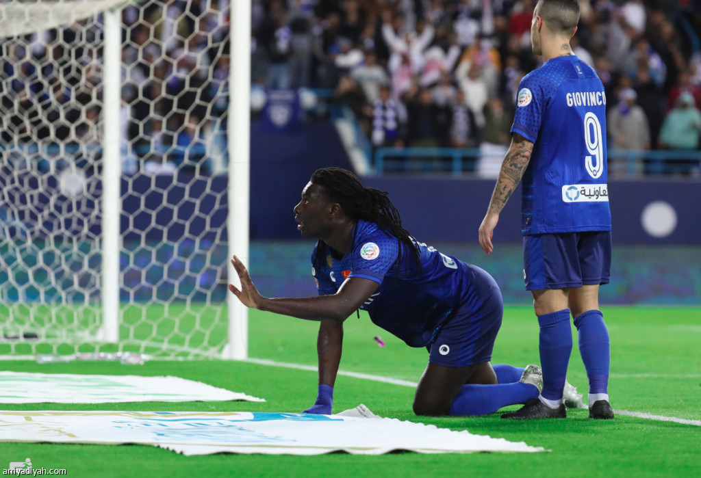 صورة التقطت أمس للفرنسي جوميز لاعب الهلال يعبر عن فرحته بعد هدفه في الأهلي ويبدو جيوفينكو زميله الإيطالي تصوير: يزيد الضويحي