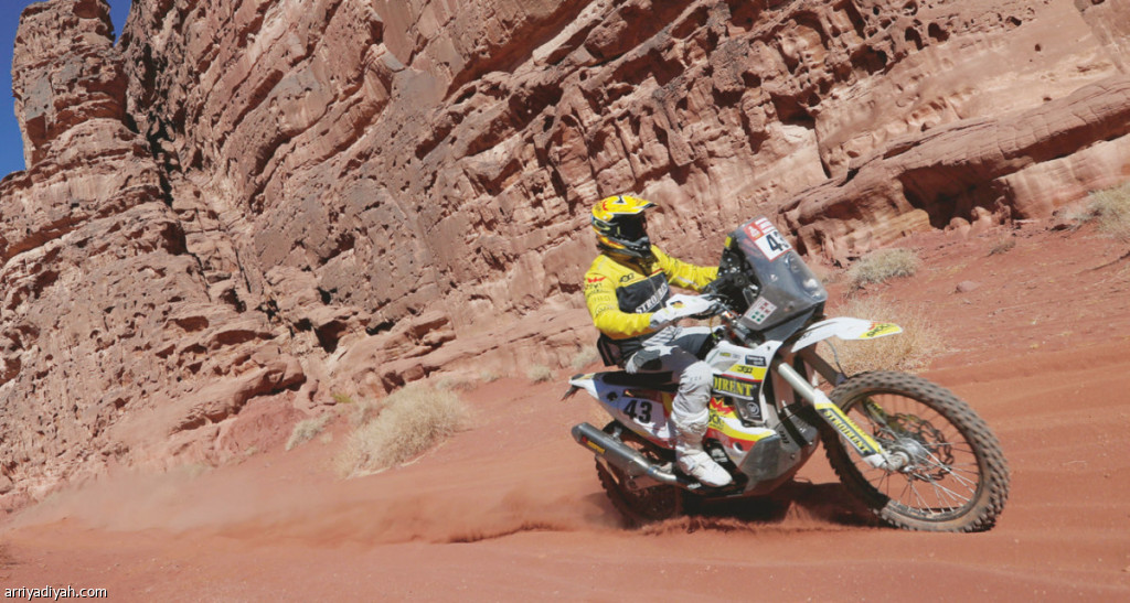صورة التقطت أمس للأمريكي ريكي برابيك منطلقًا بدراجته في سباق المرحلة الثالثة من رالي داكار 2020 في منطقة نيوم (رويترز)