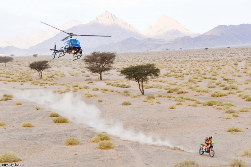 صورة التقطت للأسترالي برايس يقود دراجته كي تي إم تحت مروحية على مسار المرحلة الخامسة من الرالي (حساب برايس على تويتر)