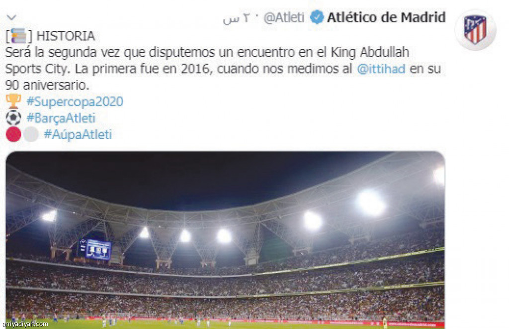 سيطرت هاشتاقات السوبر الإسباني، في جدة، على التفاعل الأكبر على موقع التواصل الاجتماعي تويتر، وخاصة #السوبر الإسبانيبجدة و #SuperCopa2020 بنحو 9.4 مليون تفاعل خلال 24 ساعة.
