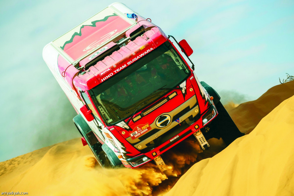 صورة التقطت أمس للياباني تيروهيتو سوجاوارا يقود شاحنته هينو على مسار المرحلة السادسة للرالي وبرفقته مواطناه موشيزوكي السائق الثاني وسوميميا الميكانيكي (أسوشيتد برس)