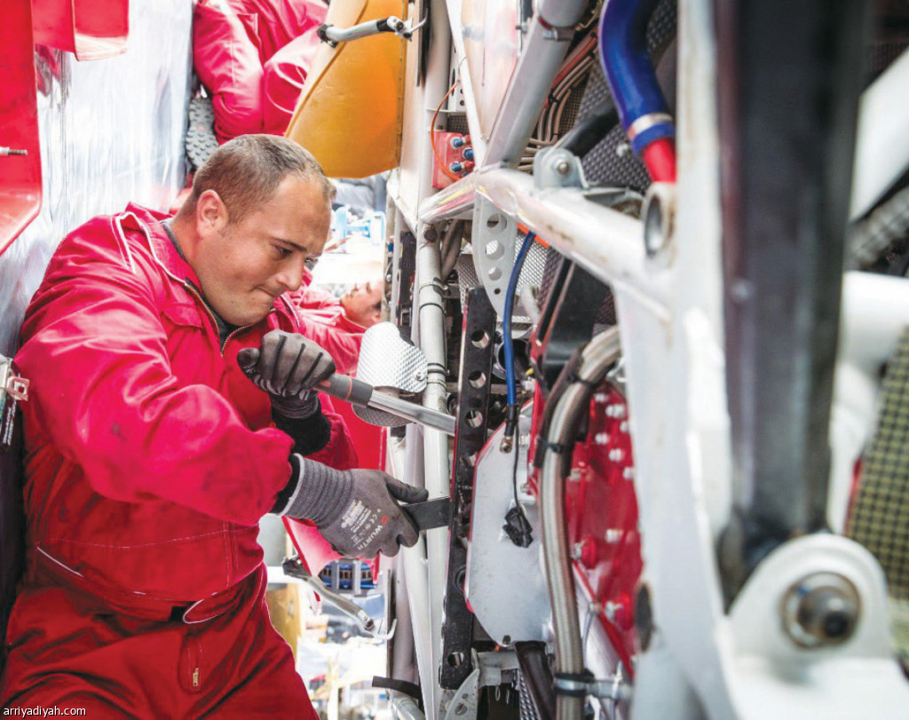 صورة التقطت أمس لأحد الفنيين يثبت عمود دوران جديدًا أسفل سيارة ألونسو (المركز الإعلامي ـ رالي داكار)