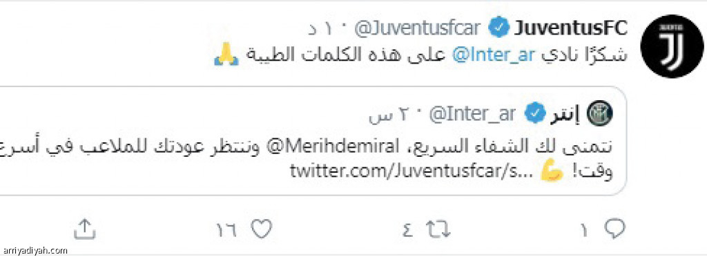 حظيت تغريدات نادي روما وإنتر ميلان التي تعاطفا فيها مع التركي مريح ديميرال لاعب يوفنتوس بعد إصابته بالرباط الصليبي والغضروف بتفاعل كبير من المغردين.