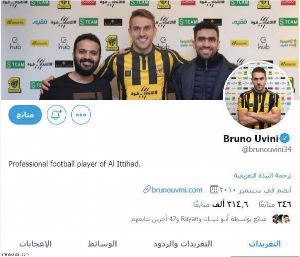 أصبحت حسابات البرازيلي برونو أوفيني، لاعب فريق الاتحاد الجديد، الأكثر متابعةً في موقعَي تويتر وإنستجرام خلال الساعات الـ 24 الماضية بعد توقيعه في صفوف العميد، إذ ارتفع عدد متابعيه إلى 17942.