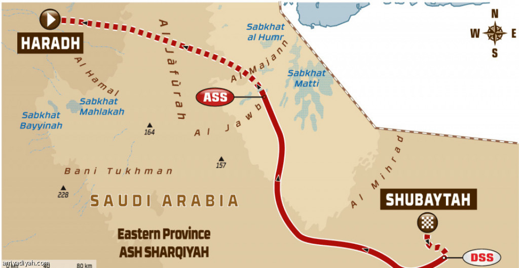 يبدأ مسار المرحلة الـ 11 من رالي داكار 2020، الواصل بين شبيطة وحرض، بمشهد رائع يمتد لمسافة 80 كيلومترًا، مزينة بأجمل الكثبان الرملية في السعودية، وفقًا لوصف الموقع الرسمي للسباق.