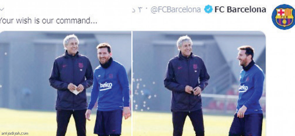 نشرت حسابات برشلونة في تويتر تغريدة، تتضمَّن صورتين للإسباني كيكي سيتين، مدرب الفريق، والأرجنتيني ميسي، مهاجمه، يتبادلان الابتسامات.