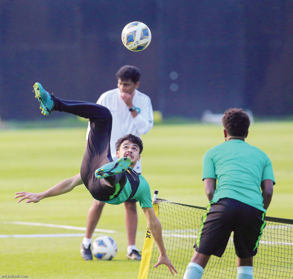 صورة التقطت أمس لناصر العمران لاعب وسط المنتخب السعودي تحت 23 عامًا يسدد الكرة بمقصية مزدوجة خلف شبكة تنس أرضي