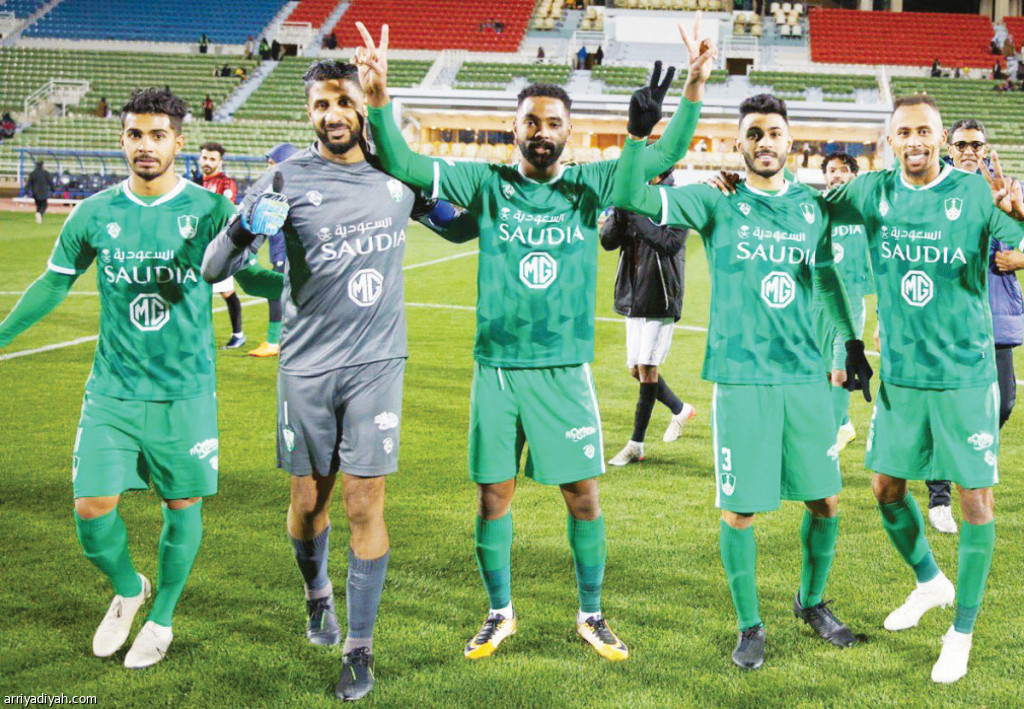 صورة التقطت، أمس، سعيد المولد ومحمد آل فتيل ومحمد خبراني وياسر المسيليم وحسين المقهوي لاعبو الأهلي يحييون الجماهير بعد نهاية المباراة (المركز الإعلامي ـ الدوري السعودي)
